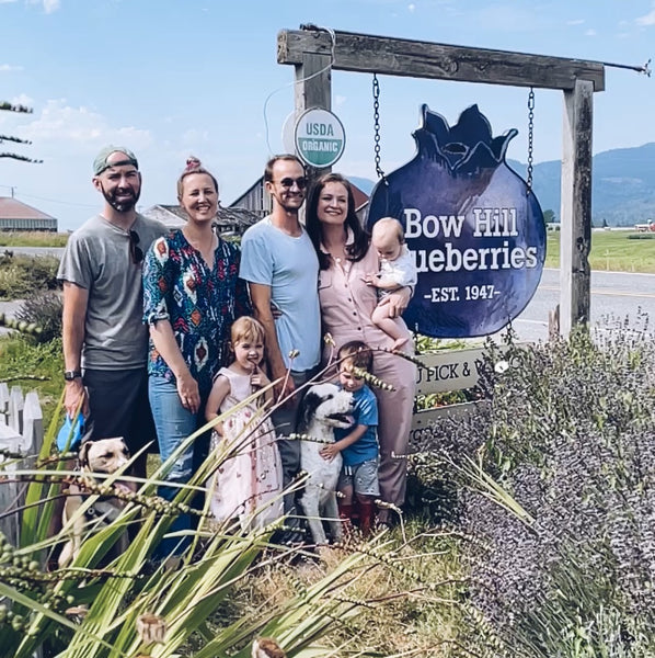 Brown cap with mesh back and Bow Hill logo patch on a blueberry bush with berries and green leaves